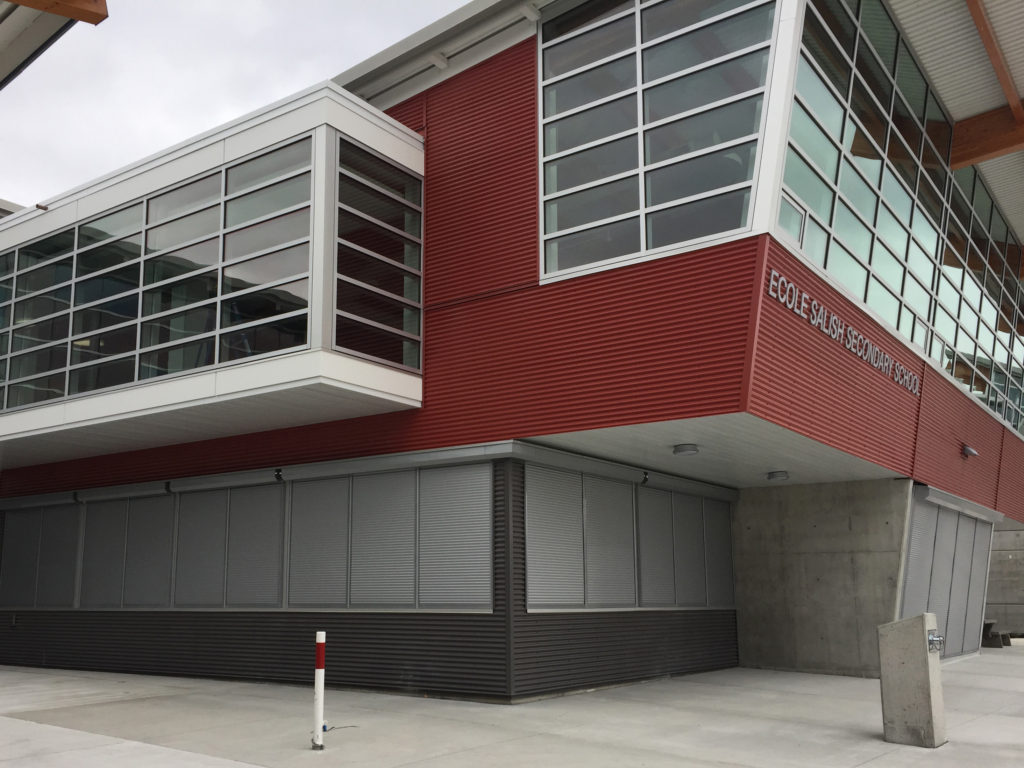 Salish Secondary School has been a constant target for vandalism in the form of graffiti, broken windows, and recent intrusions. The school contracted Talius to help fully secure the school’s exterior with our protective roll shutters. The school’s unique architecture made it challenging to fit roll shutters on every accessible window. Still, our fabrication engineers could expertly hold them onto the school’s exterior.